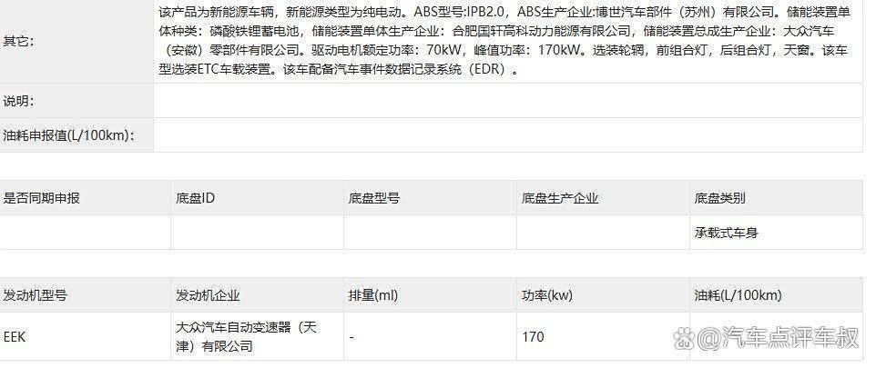动力方面,此次申报的版本为单电机后驱,搭载一台由大众汽车自动变速器(天津)有限公司提供的170kW驱动电机,与旗下与众06保持一致。电池则采用国轩高科提供的磷酸铁锂电池。虽然目前仅申报了单电机版本,但参考产品布局,未来极有可能推出双电机四驱高性能版。